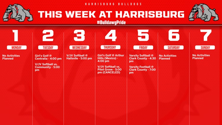 Next week is Homecoming for our Harrisburg Bulldogs. Check out the spirit days for each school in the graphics. Show your support by dressing up each day. #BulldawgPride