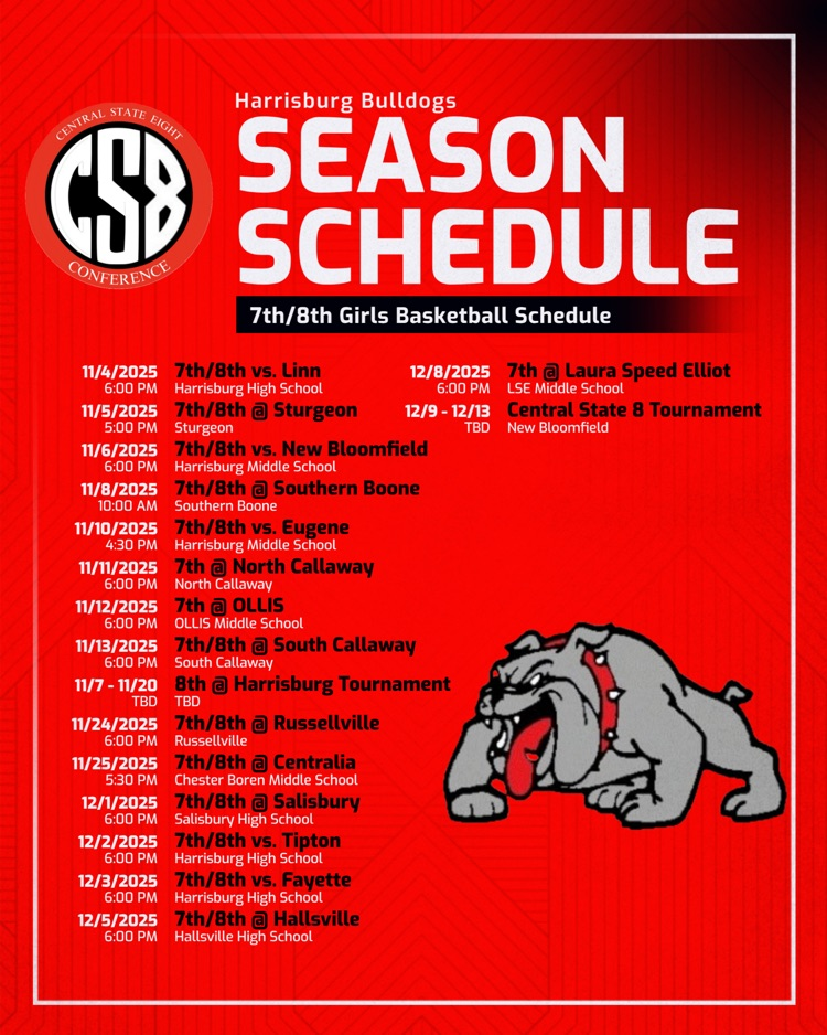 Here is the 2025 Harrisburg Bulldogs MS girls basketball schedule. #BulldawgPride