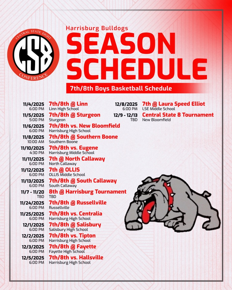 Here is the 2025 Harrisburg Bulldogs MS boys basketball schedule. #BulldawgPride