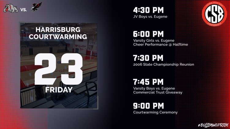 Check out tonight's itinerary for the Harrisburg vs. Eugene Courtwarming games. We are also honoring the 2006 State Championship team in between the varsity games for their 20th year reunion. #BulldawgPride