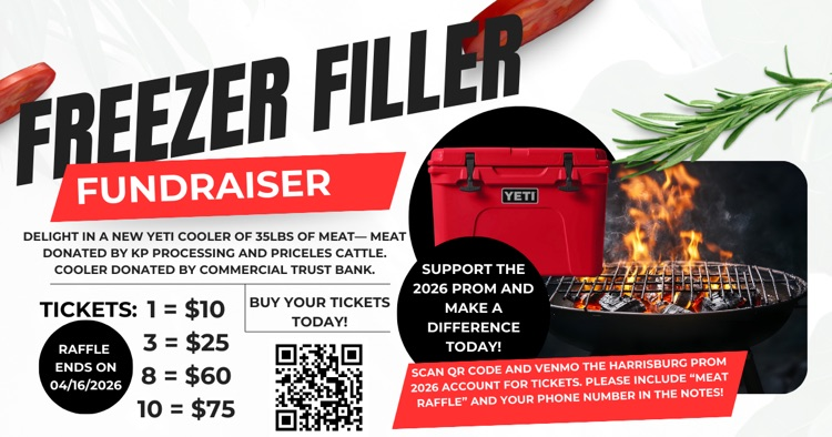 The Harrisburg Jr. parents are raffling off a Yeti cooler with 35 lbs of meat donated by KP Processing to help pay for the Jr/Sr prom. See the attached picture/flyer about the raffle.