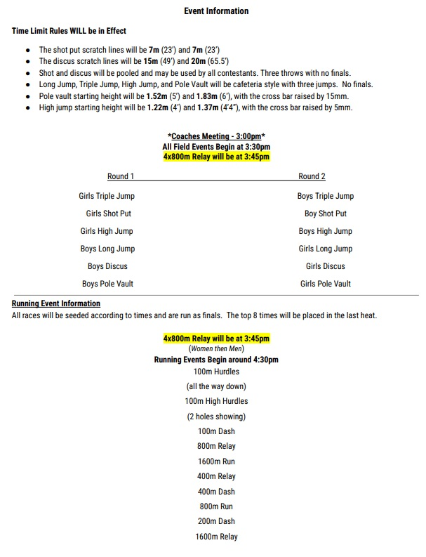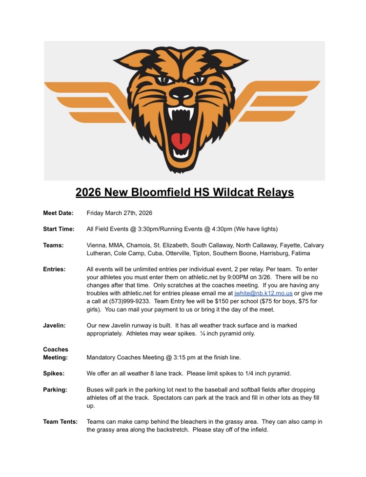 Here is the New Bloomfield Wildcat Relays information sheet for today’s meet for the Harrisburg Bulldog T&F teams #BulldawgPride
