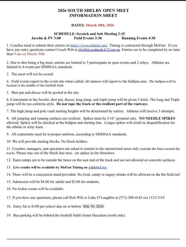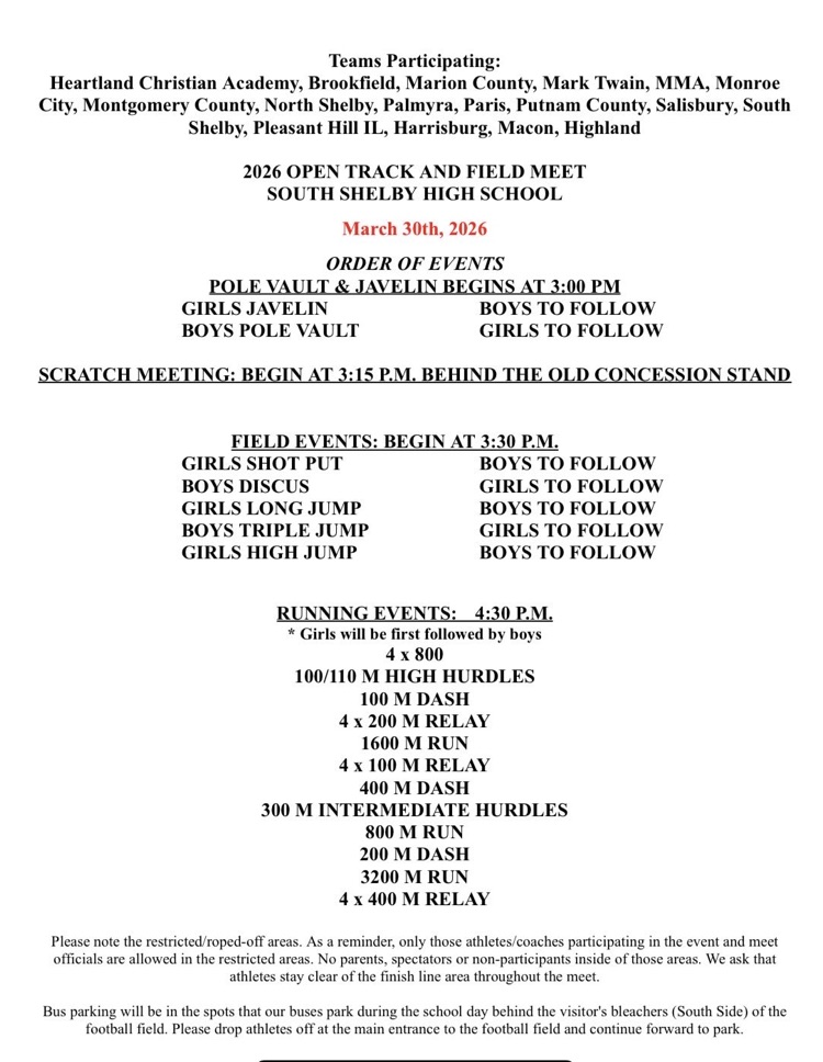 Here is information regarding the South Shelby Open for our Harrisburg HS T&F teams today.