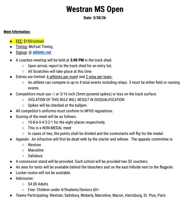 Here is information regarding the Westran Open for our Harrisburg MS T&F teams.