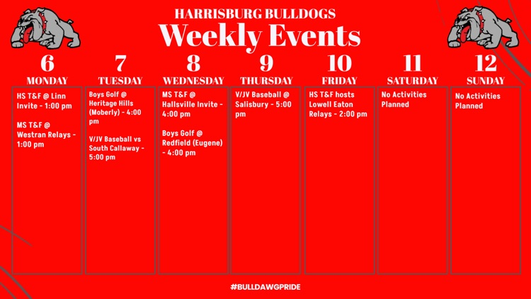Good luck to the Harrisburg Bulldog HS T&F teams today at the Centralia Open at 4:00 pm!!! #BulldawgPride