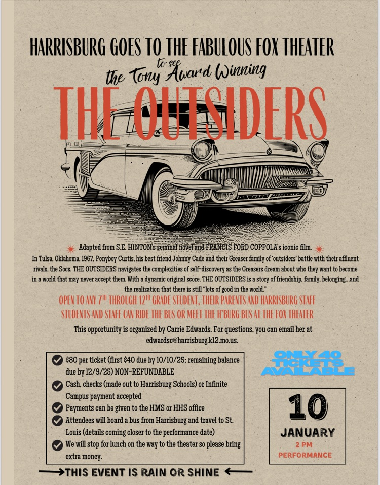 Harrisburg will travel to the Fox Theatre to see The Outsiders. The field trip planned for 1/10/26.