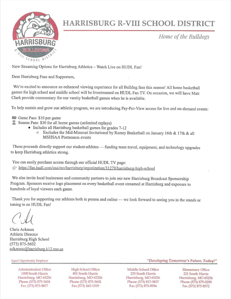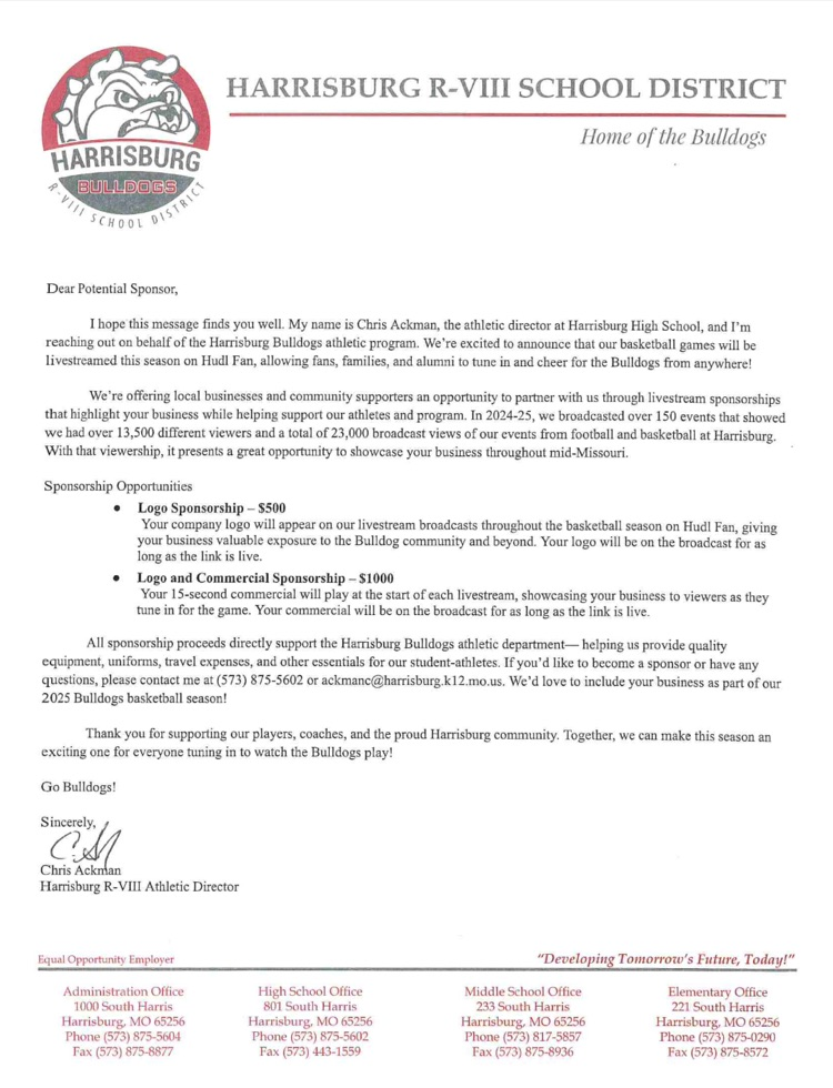 If interested in becoming a Harrisburg livestream sponsor for the basketball season, please contact Chris Ackman at (573) 875-5602. Thank you for your support of the Harrisburg Bulldogs! #BulldawgPride