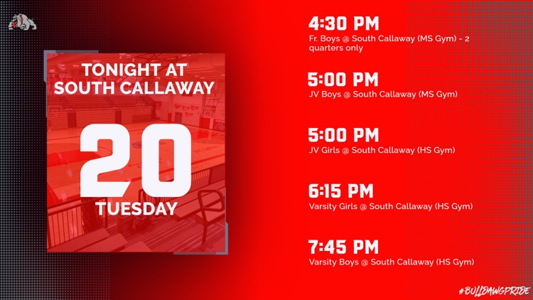Check out tonight’s schedule for Harrisburg at South Callaway for tonight’s Central State 8 conference matchup. #BulldawgPride