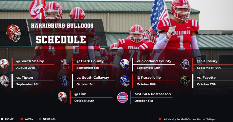 Friday Night Lights are back!!! Check out the Harrisburg Bulldogs varsity football schedule. They open at South Shelby this Friday at 7:00 pm. #BulldawgPride