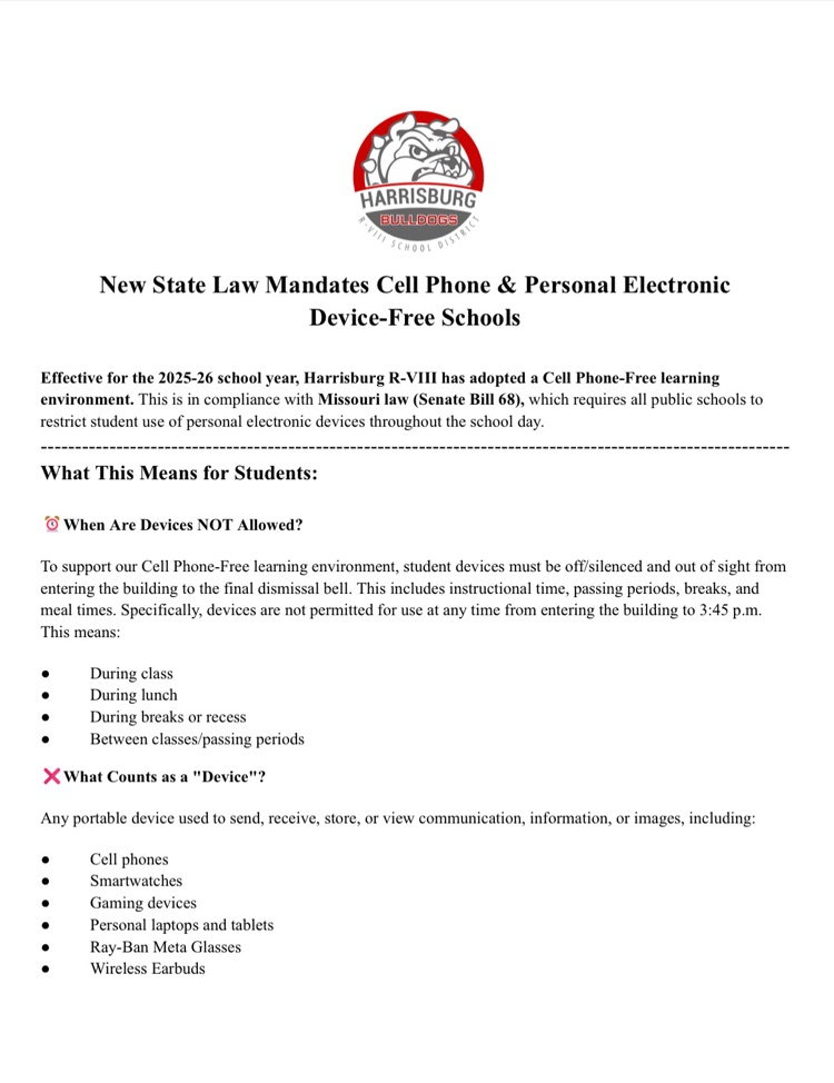 Please see the attached graphic regarding Missouri Senate Bill 68 and the Harrisburg School District’s updated cell phone policy for the 2025-26 school year.