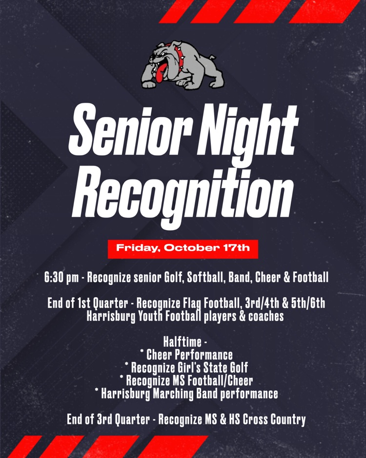 Along with Senior Night and Youth Football Recognition, there will performances by our cheerleaders and marching band. It will be a great night to recognize our Harrisburg students #BulldawgPride